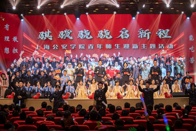 12月30日晚,在第六个中国人民警察节即将到来之际,学院举办“崇景有我·骐骥骁骁启新程”青年师生迎新主题活动。活动通过信念如磐、铸剑·缘起、熔炉·淬炼、征途·有我四个篇章,以管乐、朗诵、歌舞、演讲等相关学生社团孵化的艺术形式,集中汇演“青澜”文化节成果,生动展现闪光青年奋斗风采,精彩展示立德树人机制和五育并举建设成效,表达了学院师生忠诚为党、人民至上的坚定信念。学院党委班子成员,浦东校区各部门负责同志,兄弟院校学生会负责人和学院青年师生代表1500 余人参加。