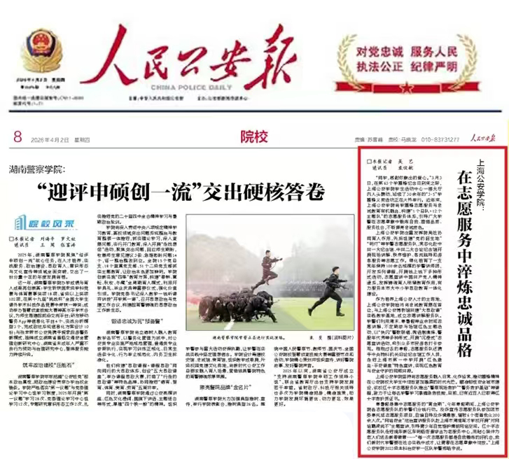 4月2日出版的《人民公安报》以题为“在志愿服务中淬炼忠诚品格”报道学院近年来将学雷锋志愿服务与忠诚教育有机融合,构建志愿服务体系,引导广大学警在志愿奉献中锻炼自我、塑造品质、服务社会,不断擦亮忠诚底色。
